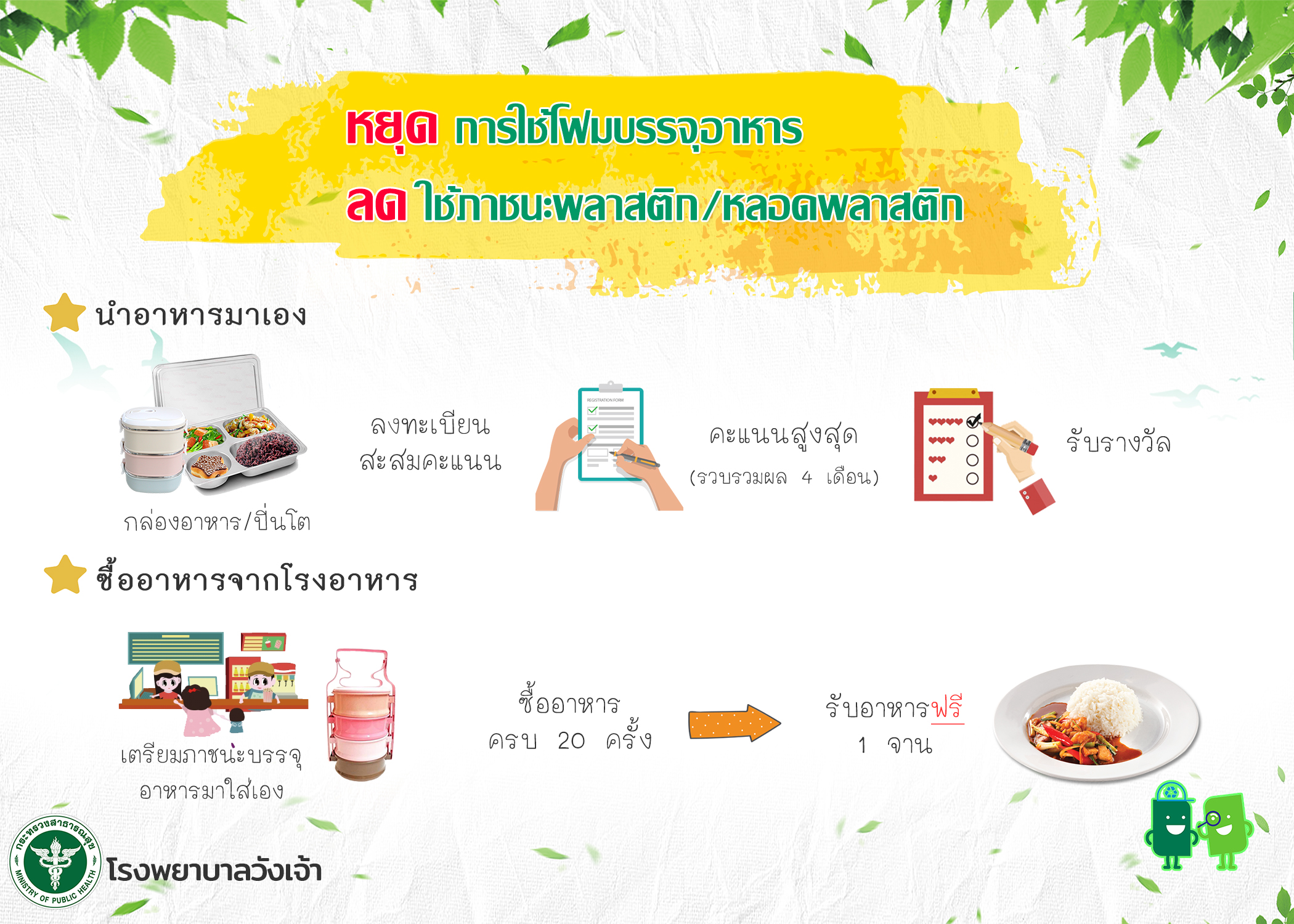 ขอเชิญชวนบุคลากรโรงพยาบาลวังเจ้าทุกท่าน ร่วมรณรงค์การลดใช้ภาชนะโฟมบรรจุอาหารและพลาสติก ตามนโยบายของโรงพยาบาลวังเจ้า