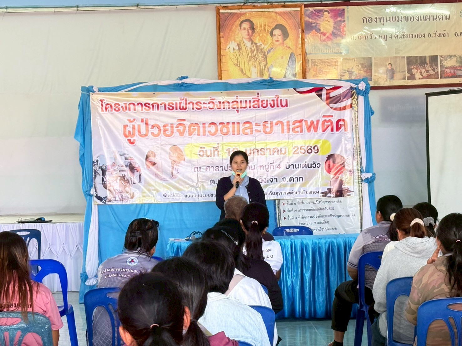 ในชุมชน โดยมีผู้เข้าร่วมประกอบด้วย แกนนำสุขภาพประจำครอบครัว และผู้ดูแลผู้ป่วยจิตเวช จำนวนทั้งสิ้น ๗๐ ราย ณ ศาลาประชาคม บ้านเด่นวัว ตำบลเชียงทอง อำเภอวังเจ้า โดยได้รับเกียรติจากวิทยากรสถานีตำรวจภูธรวังเจ้า โรงพยาบาลส่งเสริมสุขภาพตำบลบ้านวังเจ้า และโรงพยาบาลวังเจ้า เป็นวิทยากรในการดำเนินโครงการในครั้งนี้