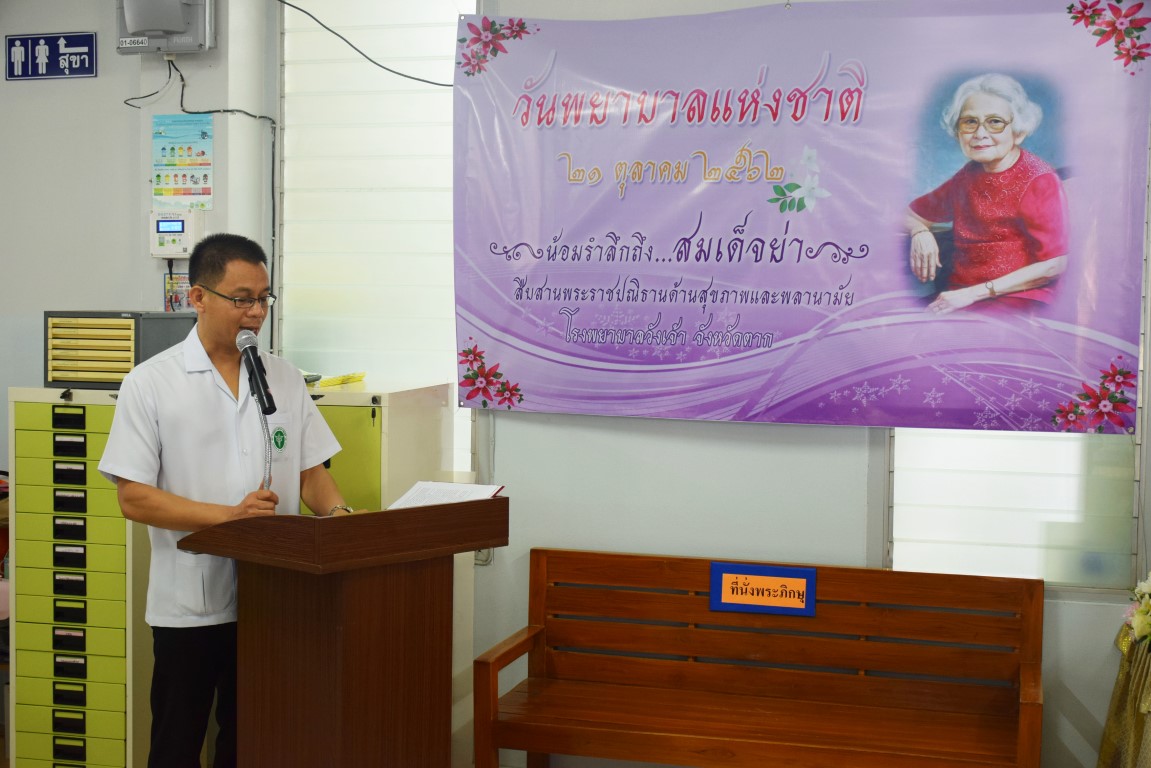 วันที่ 21 ต.ค. 2562 นายแพทย์พิจารณ์ สารเสวก ผู้อำนวยการโรงพยาบาลวังเจ้า จังหวัดตาก ให้เกียรติเป็นประธานถวาย วางพานพุ่มดอกไม้สด ในพิธีสักการะสมเด็จพระศรีนครินทราบรมราชชนนี เนื่องในวันพยาบาลแห่งชาติ วันทันตสาธารณสุขแห่งชาติ โดย นางธัญพร จรุงจิตร หัวหน้าพยาบาล ทีมผู้บริหาร พยาบาลวิชาชีพ บุคลากร และประชาชนทั่วไป เข้าร่วมในพิธีดังกล่าว ณ อาคารผู้ป่วยนอก โรงพยาบาลวังเจ้า จังหวัดตาก